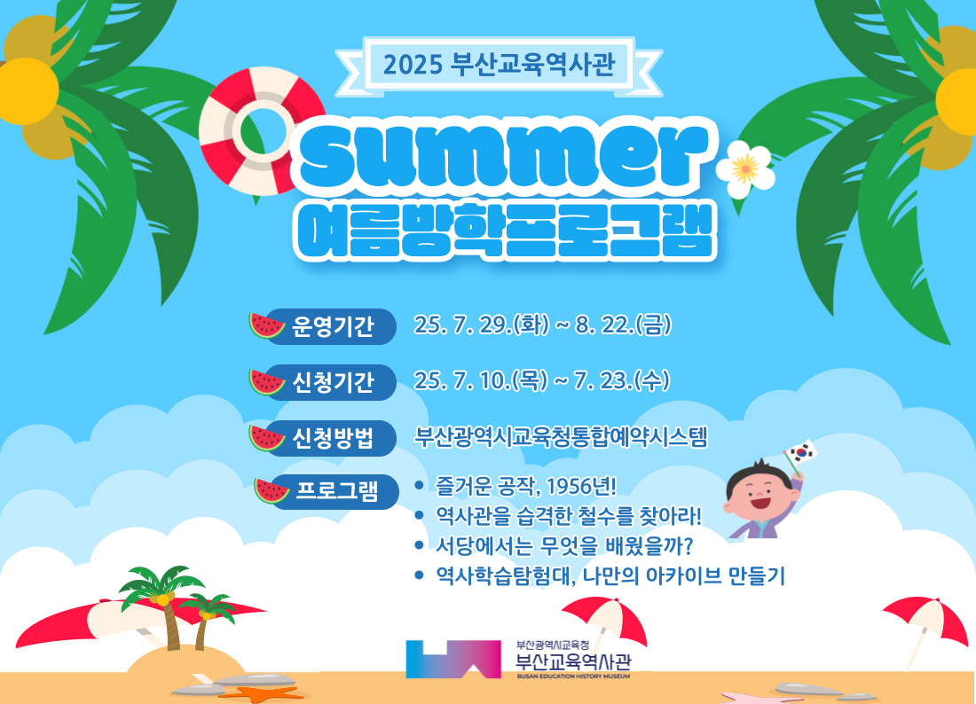 ○ 부산광역시립중앙도서관 분관 부산교육역사관(분관장 이경희)은 오는 7월 29일부터 8월 22일까지 여름방학을 맞아 지역 초등학생을 위한 ‘여름방학 프로그램’을 운영한다.